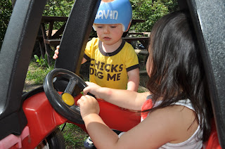 We really lucked out last week for our picnic! The rain clouds were all around us, but we never felt a drop! The kids really enjoyed going to Aidan and Logan's school and watching all the "big Kids!"
